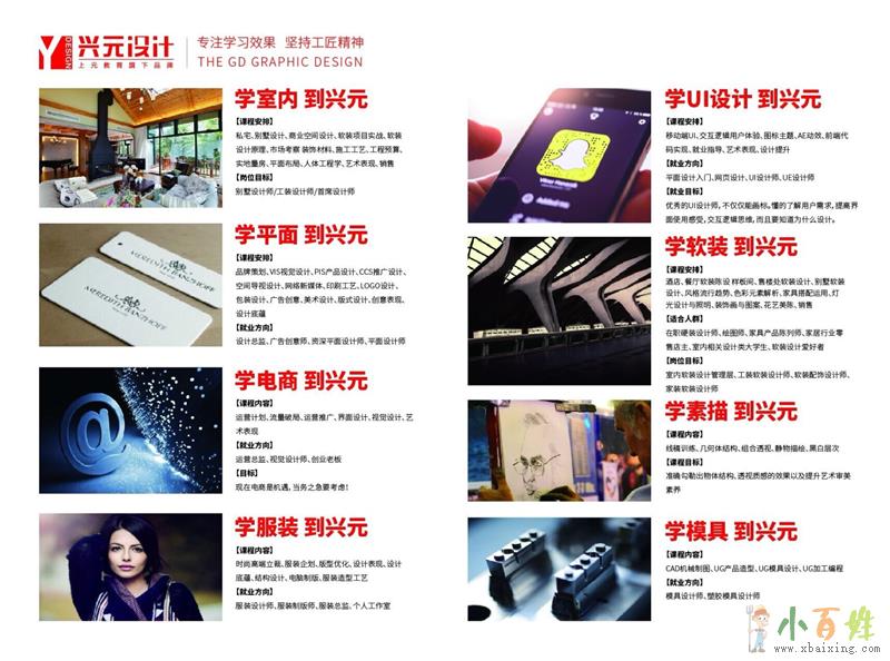 兴元设计从2005以来,专注于平面设计课程的研发和更新,有自己独立的教学体系,几十所分校遍布全国,为社会培养无数的优秀设计人才,旨在培养独立设计师,能策划,能制作,能推广。平面设计卓越护航班从基础素描教学到软件应用,再到理论灌输,通过模拟真实案例实操,让你在短期内成为行业翘楚